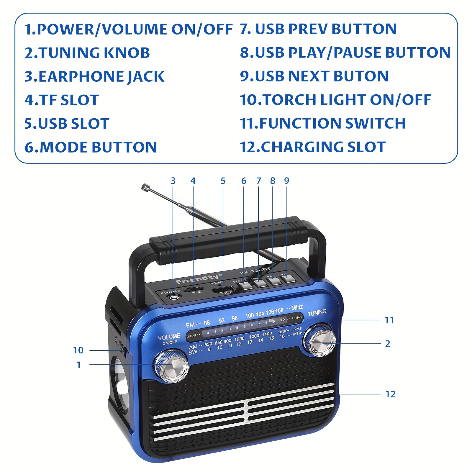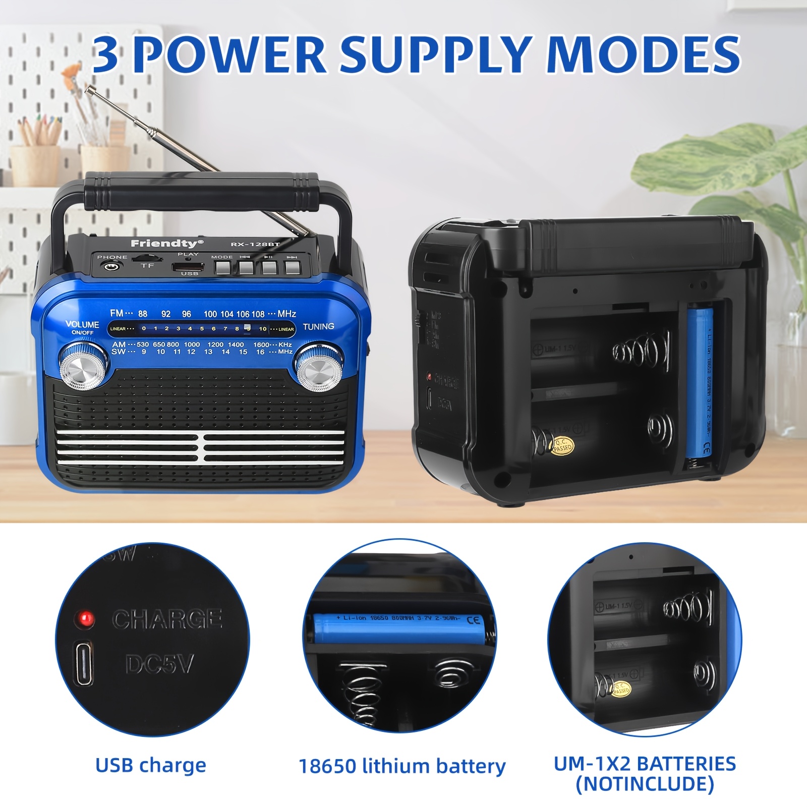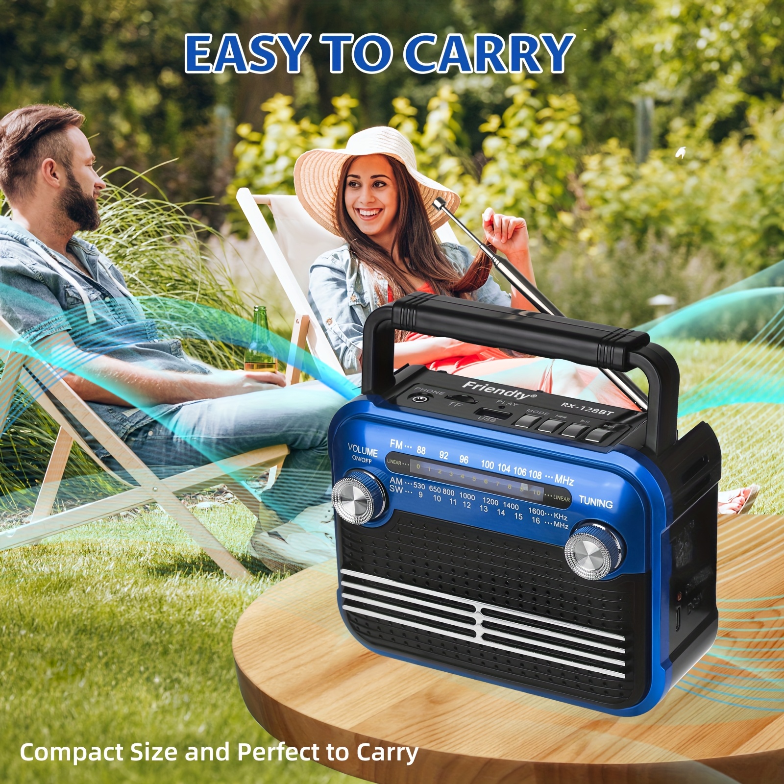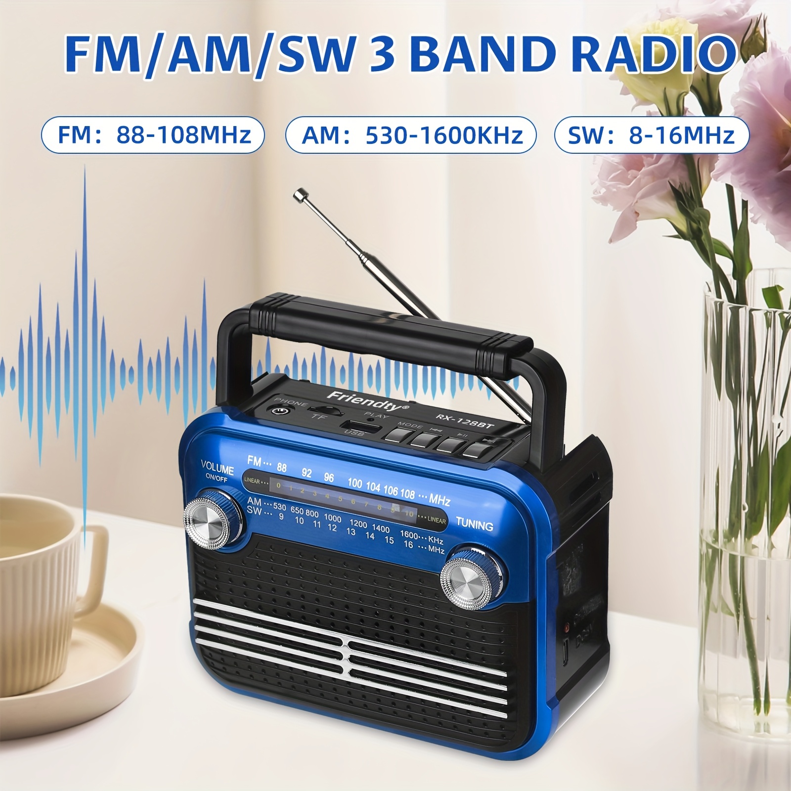 128BT Portable FM Radio, Full Bandwidth Sound, Large Knob Easy Operation, FM/AM/SW1-6/USB/TF/BT Playback, Battery Powered - Multi-Band Home Handheld Flashlight Radio for Indoor and Outdoor Use