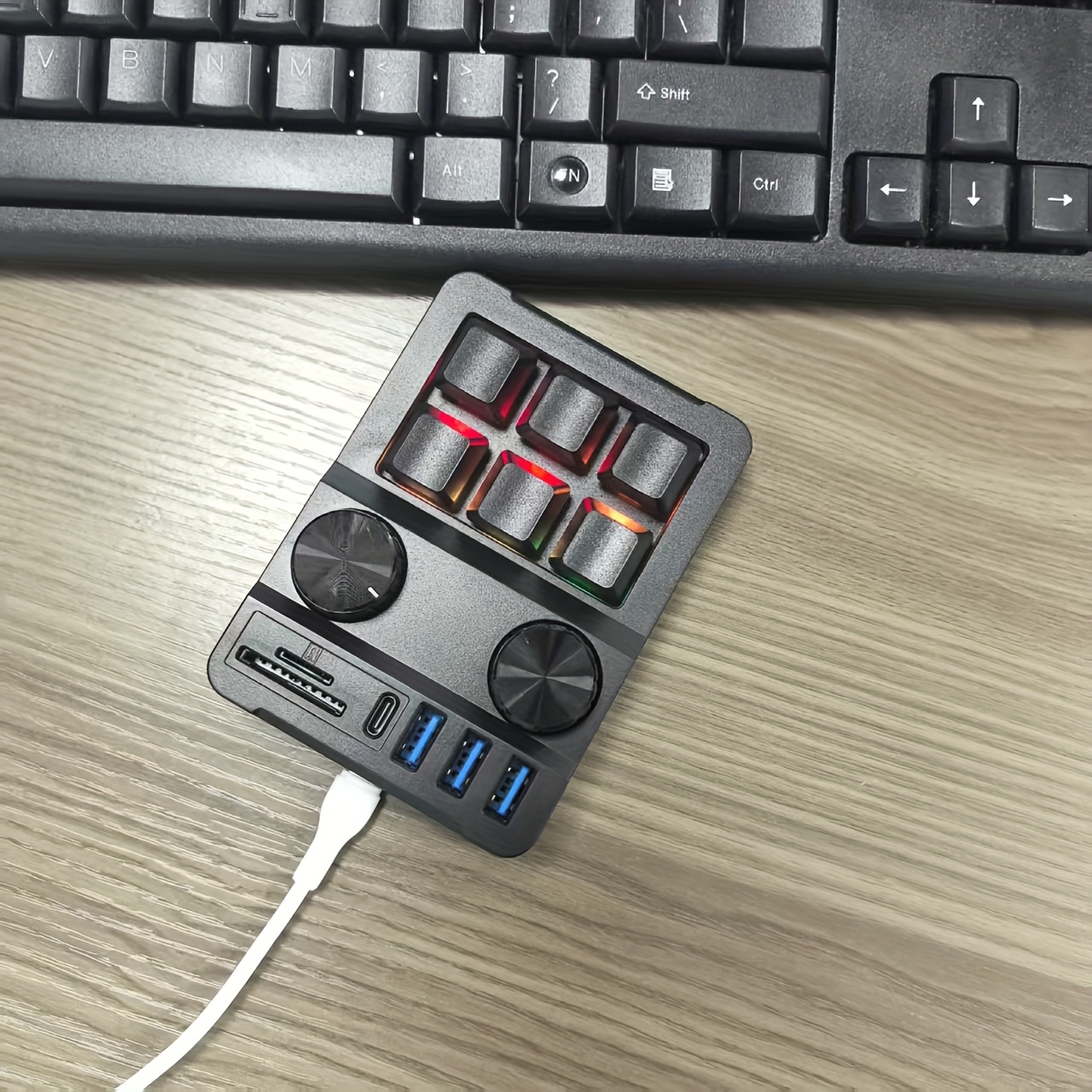 Multi-functional 6-key macro keyboard with USB hub and knob - Boost your productivity!Compatible with IOS and Windows.