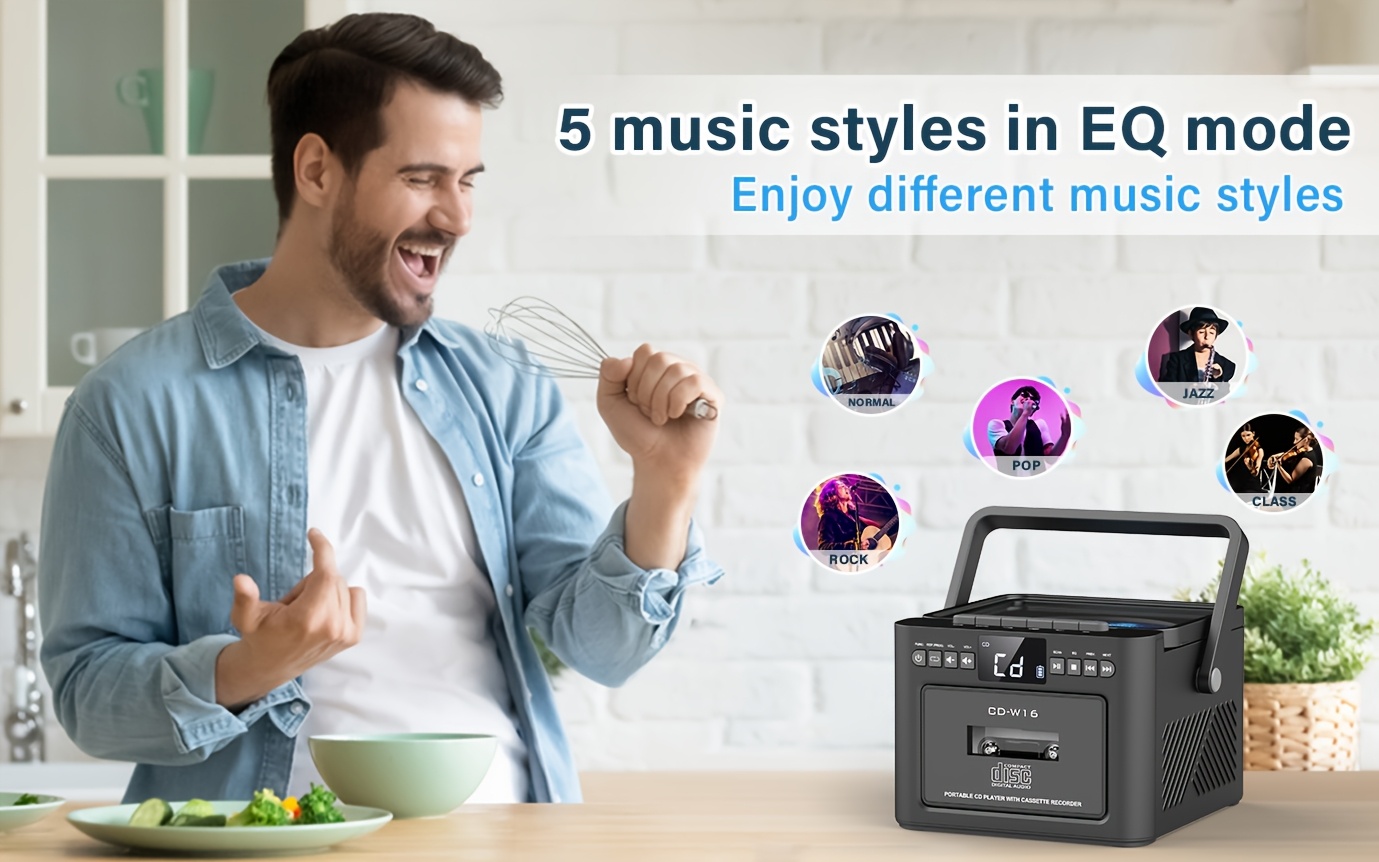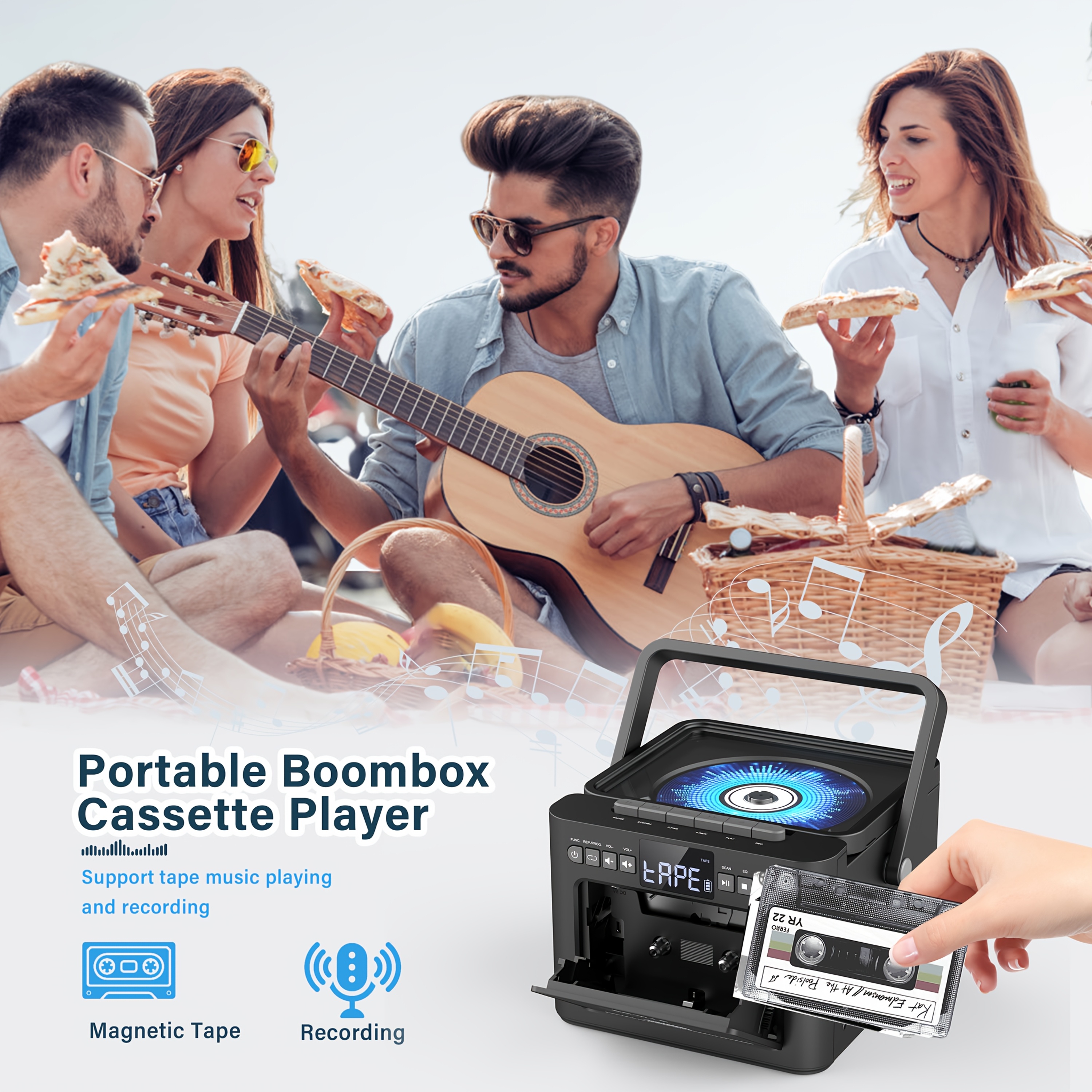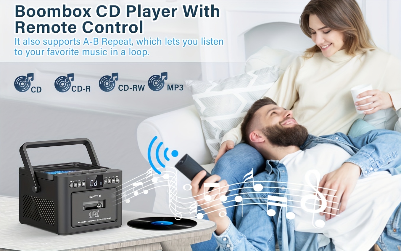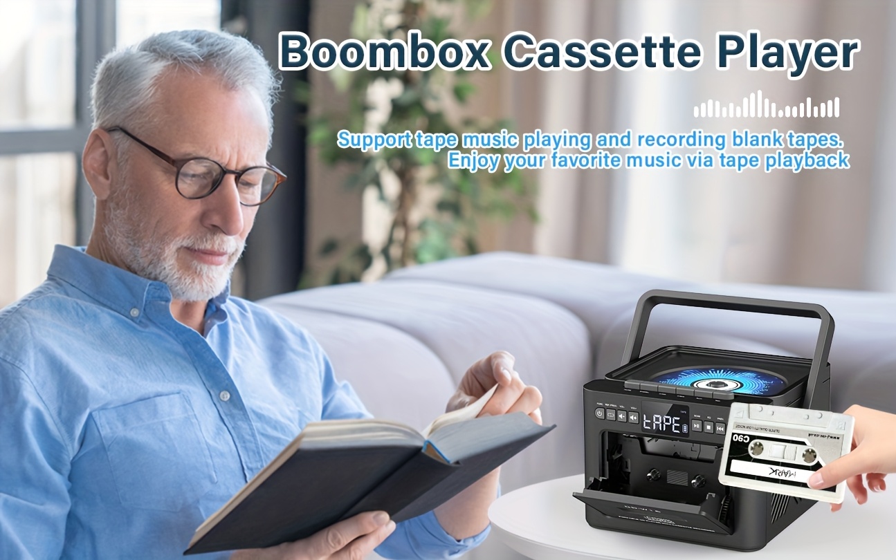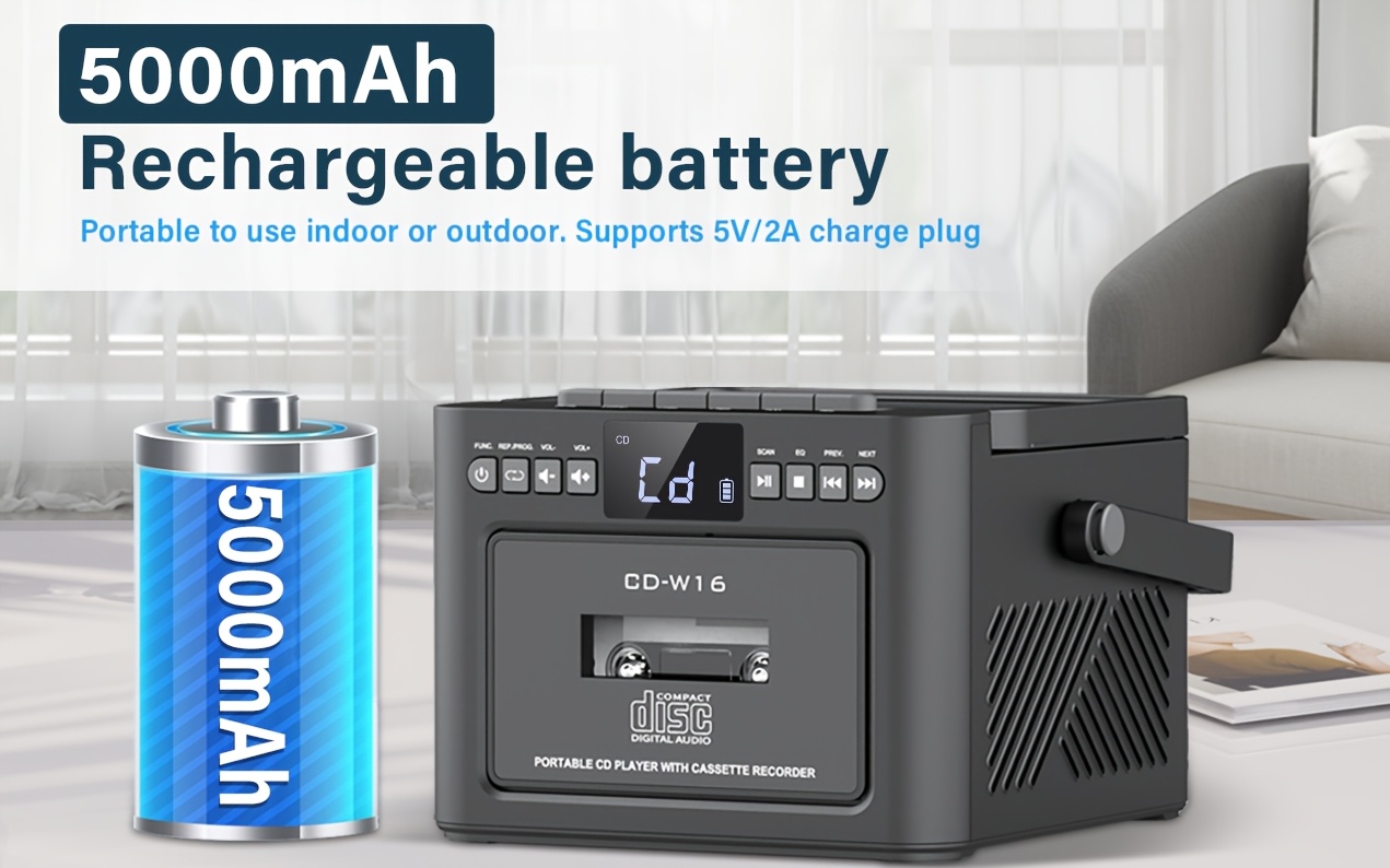 Boombox Cassette CD Player with 5000mAh Battery, 5W Dual Stereo Speakers, Rechargeable CD Player with FM Radio, Remote Control, Tape Recording, 3.5mm Earphone Jack, AUX/Micro SD/USB for Home
