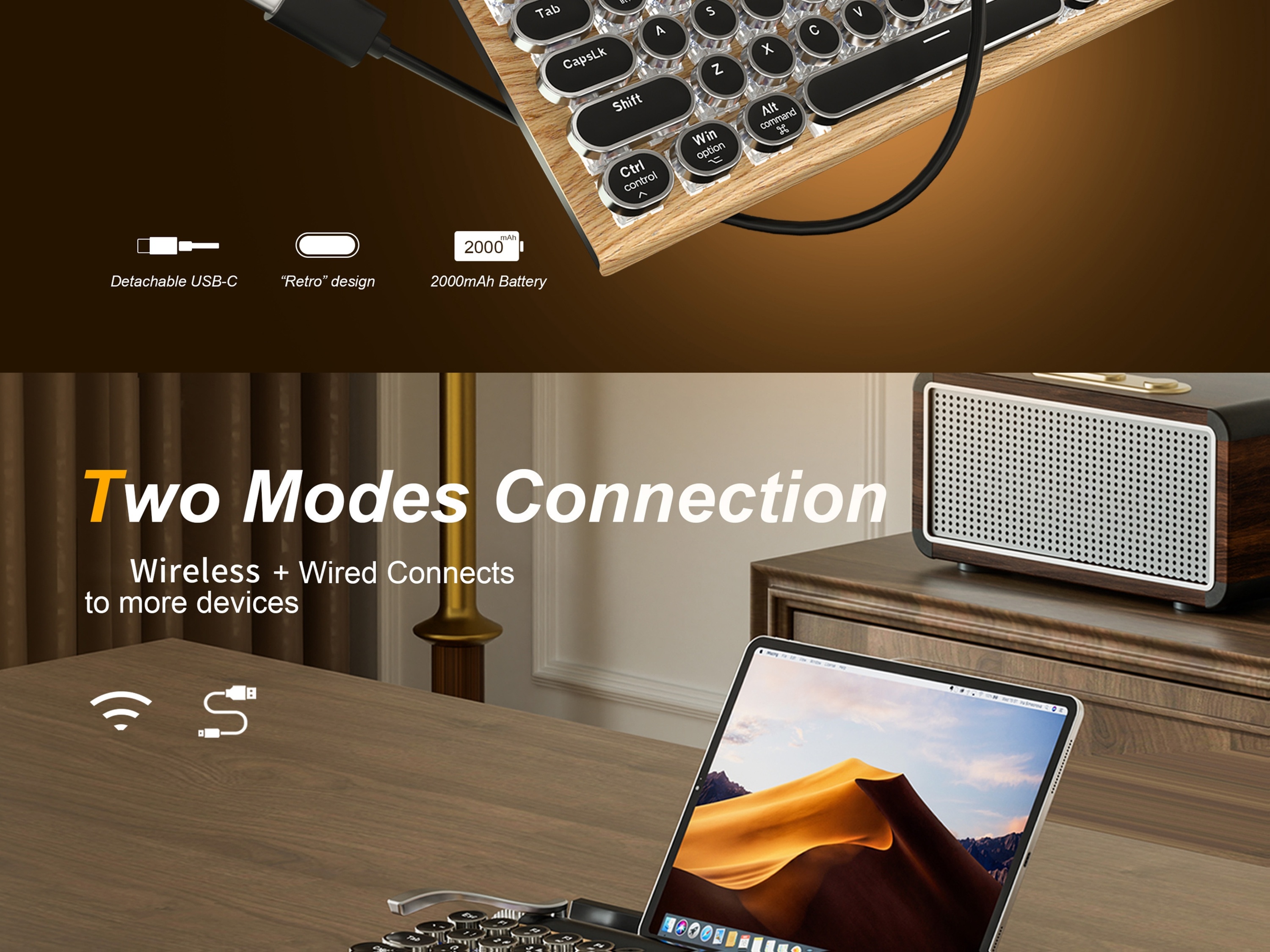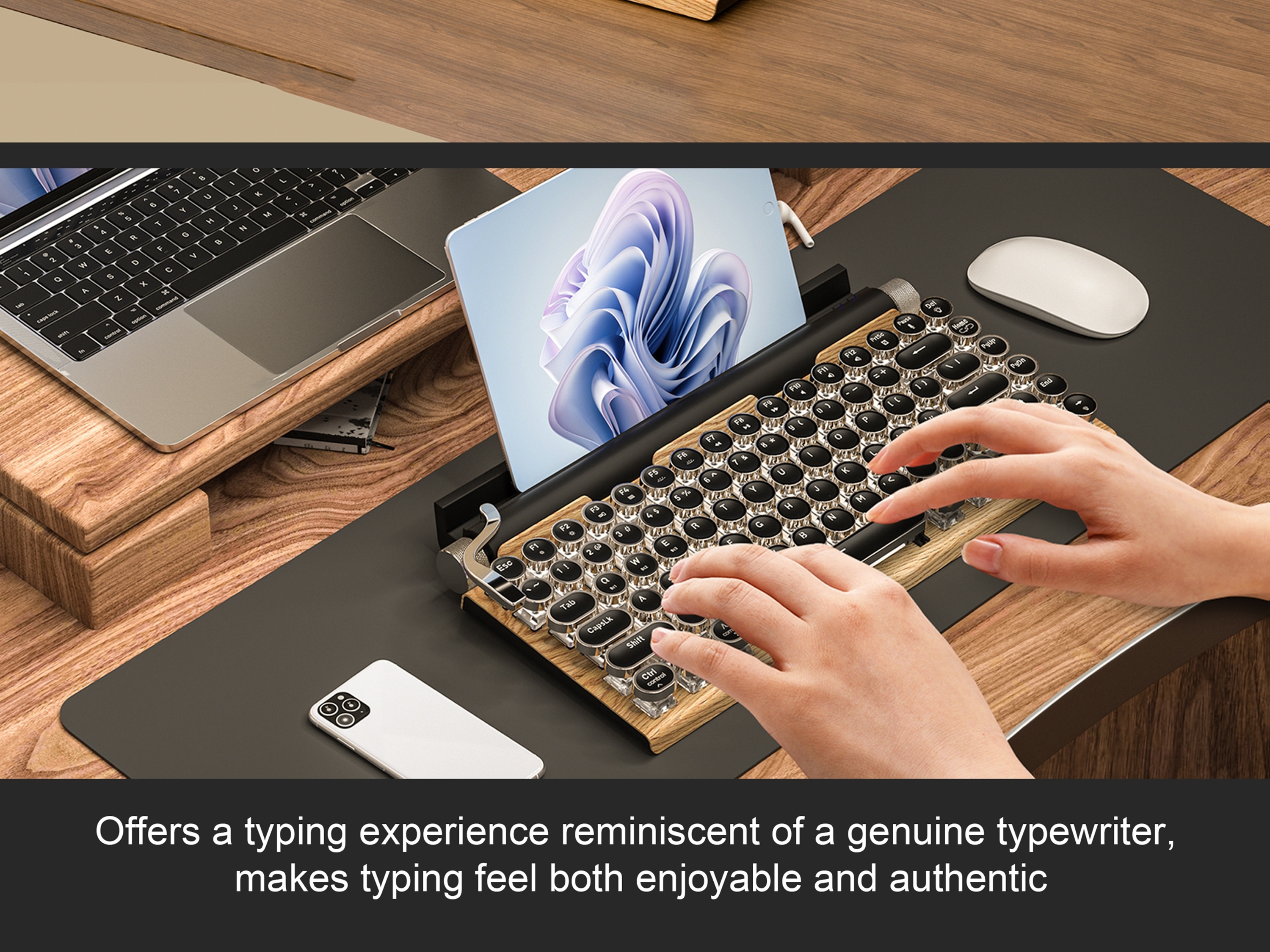 Retro Typewriter Wireless Mechanical Gaming Keyboard, Wireless Office Computer Vintage Keyboards 83-Key Blue Switches Punk Round Keycap, LED Backlight, Compatible With PC/Laptop/Pad/Phone
